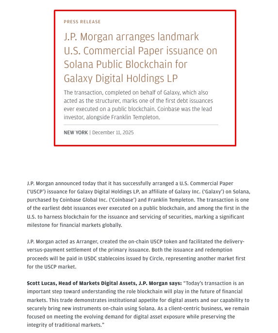 J.P. Morgan arranged a fifty million dollar onchain commercial paper issuance for Galaxy Digital on Solana, settled entirely in USDC.